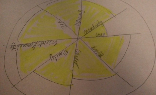 Part Two is all about reflection and has an astonishing array of exercises to get you deep into your own head which is not something I have a problem with so it was all really enjoyable. You start with a wheel of life exercise covering the different aspects of your life, where you gain that sense of satisfaction, you choose eight of these creating a pie chart, with each aspect as a segment, which you then you then fill in to the extent to which you feel you are fulfilled – full segment equals complete fulfillment (Mine is the photo above). Any area that’s really low indicates an aspect where you should put more focus. You then move on to brainstorming activities about what you loved to do when you’re younger, the roles that you play in life and what you love about them, and delve deeper into your history with the events that represents high and low points and tie these all together with those aspects you identified earlier.